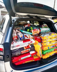 The month-long initiative encouraged donations of pet food, toys, cleaning supplies, and other essentials to support local animals in need. The results were extraordinary: two Subaru Foresters completely filled with donations, and an additional two full pallets—nearly 3,000 pounds—of dog food donated by The Mill. These contributions will help feed and care for shelter animals as well as pets in the community who rely on the Humane Society’s Pet Food Pantry.